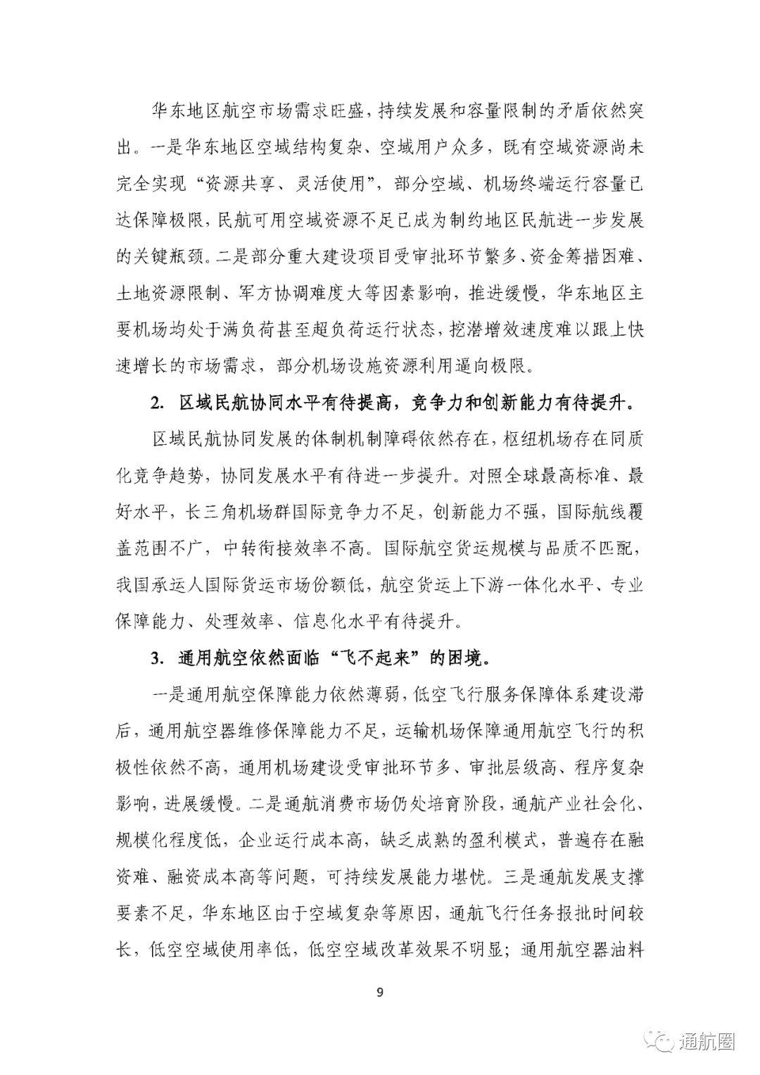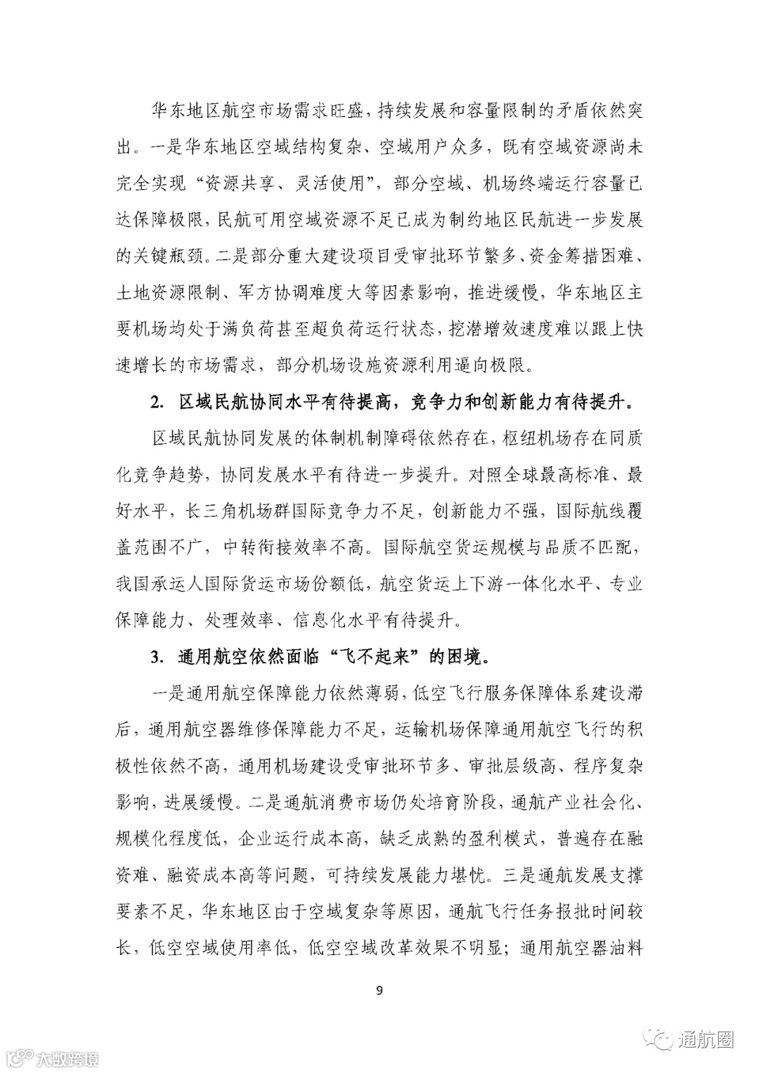 但是通用航空依然面临“飞不起来”的困境。一是通用航空保障能力依然薄弱,低空飞行服务保障体系建设滞 后,通用航空器维修保障能力不足,运输机场保障通用航空飞行的积 极性依然不高,通用机场建设受审批环节多、审批层级高、程序复杂 影响,进展缓慢。二是通航消费市场仍处培育阶段,通航产业社会化、 规模化程度低,企业运行成本高,缺乏成熟的盈利模式,普遍存在融 资难、融资成本高等问题,可持续发展能力堪忧。三是通航发展支撑 要素不足,华东地区由于空域复杂等原因,通航飞行任务报批时间较 长,低空空域使用率低,低空空域改革效果不明显;通用航空器油料加油站稀缺,临时加油困难大;行业专业人才稀缺,稳定性差。