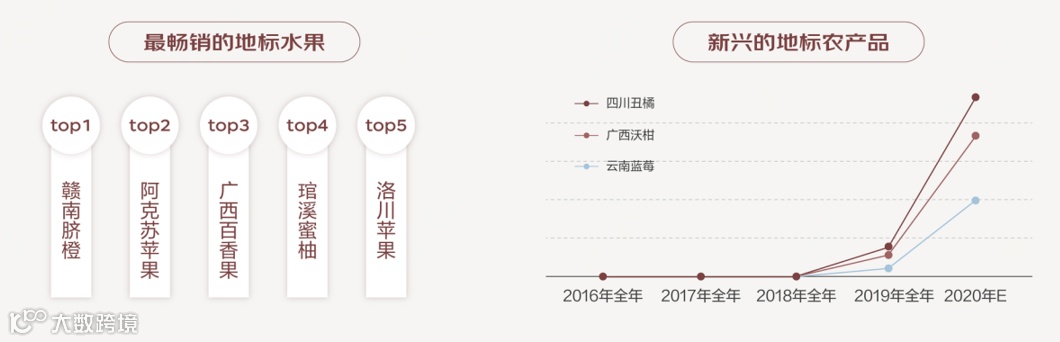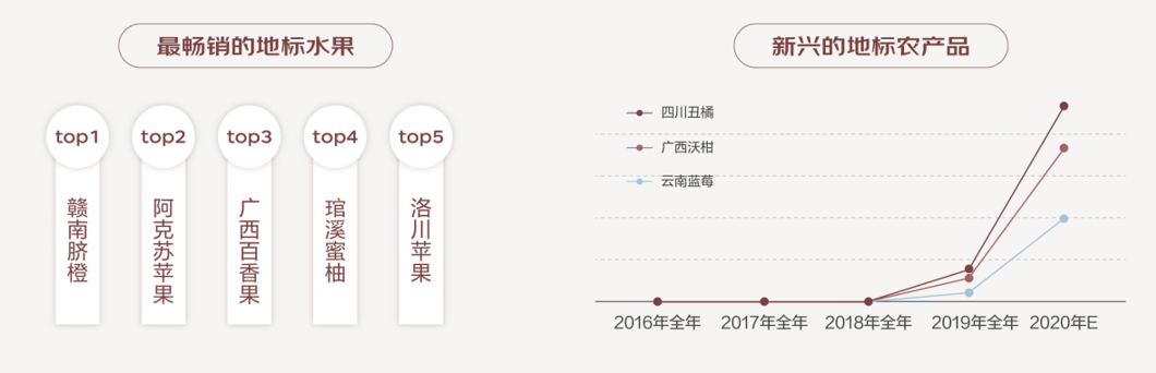 近几年,地标类农产品很受欢迎。中国的知名农产品品牌还不多,很多人买农产品时首先看产地在哪。产地成为农产品品质的首要标签。2020上半年,地标类农产品成交额同比增长74%,环比增长50%。在2019年之前线上销量非常少的农产品,比如四川丑橘、广西沃柑、云南蓝莓,2020年的销量发生了飞跃性的提升。人们关注营养,也爱尝新,更习惯于通过原产地搜索和评价农产品,以后线上市场的地区特产也会越来越多。