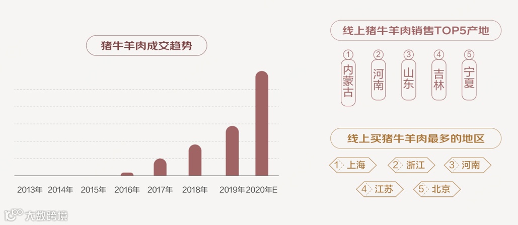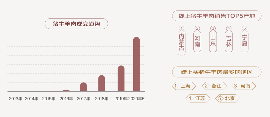 肉类在线上大量消费开始的时间比较晚,受疫情影响,2020年上半年出现了近8年最大的增幅。内蒙古、河南、山东产地的猪牛羊肉线上成交额最高,上海、浙江、河南则是线上买肉占比最高的省份。