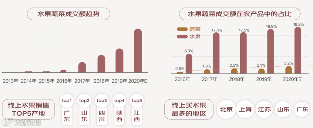 随着冷链物流服务的覆盖越来越广,在网上买新鲜的水果蔬菜早就不是问题。在农产品销售中,水果、蔬菜的市场份额也在逐年提升。2020上半年,线上水果销售占农产品整体销售的近20%。广东、山东、四川的水果线上成交额最高,北京、上海、江苏则是线上最大的水果消费市场。