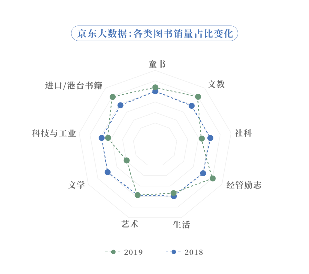 相比2018年,去年的全民阅读习惯进一步转向实用、精致、多元,例如进口和港台书籍占比上升,励志与成功类书籍同比大幅增长,艺术、婚恋、科学类书籍都有不少增长,文学类虽然占比有所下降,但依然与童书、文教类占据成交额榜前三名。