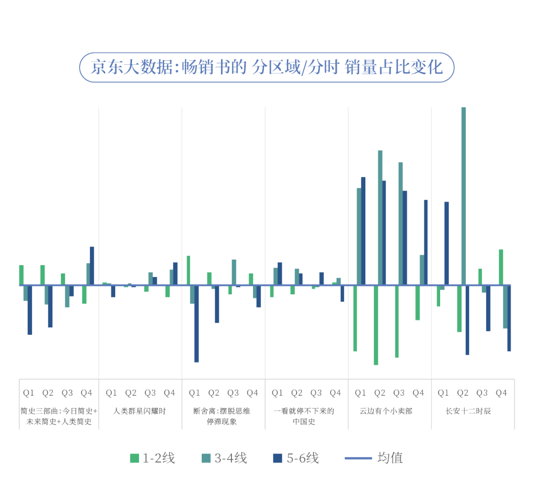 通过对更多不同类型的畅销书的区域销量分布进行跟踪分析后发现,书的学术性、实用性、易读性、读者获知渠道等因素,会影响其在不同线级的市场中的销量表现,但随着时间推移,销量分布差异会被逐渐抹平。