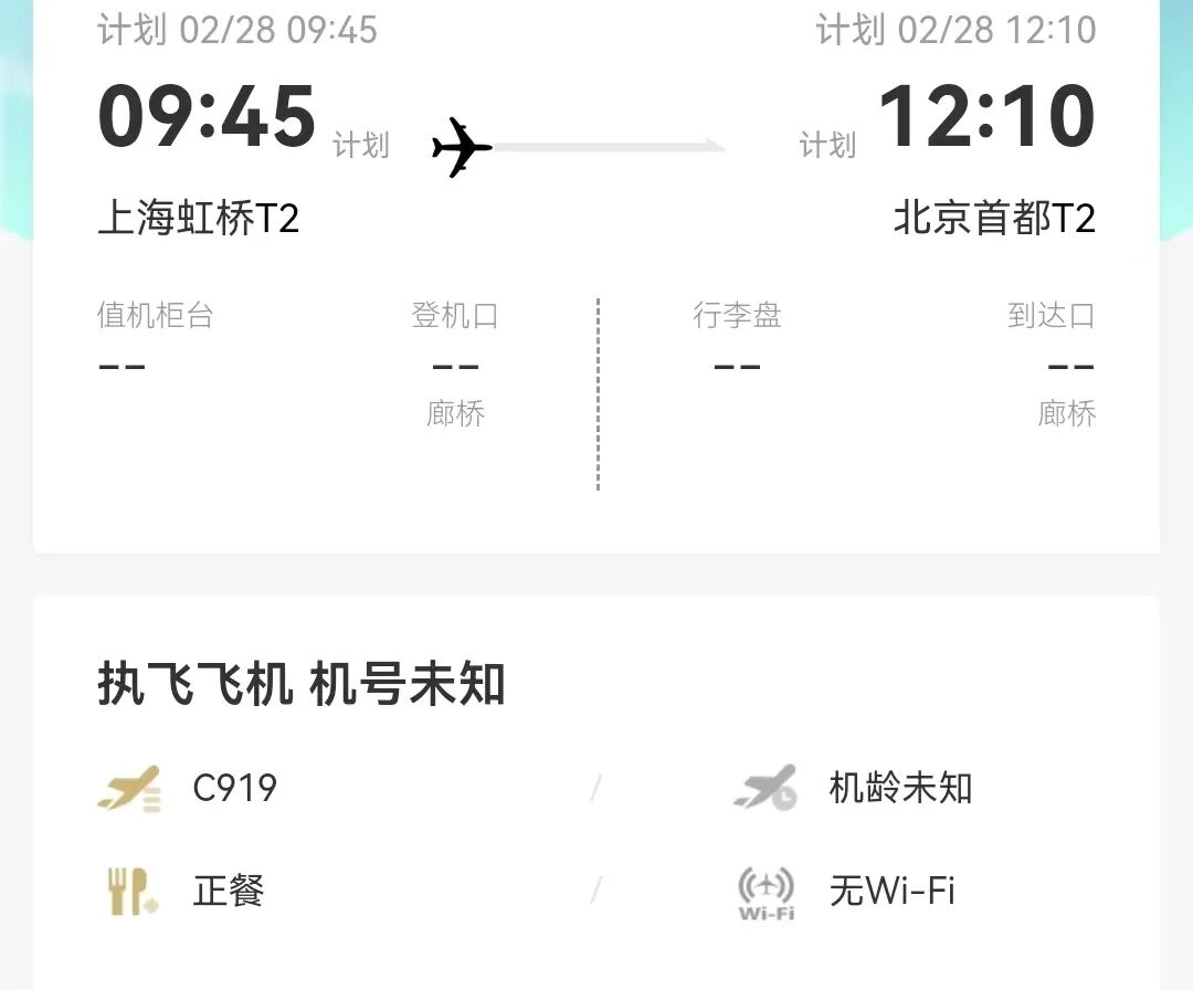 东航APP消息显示,2月28日,MU9191航班计划于9:45从上海虹桥机场起飞,于12:10落地首都机场。MU9192航班计划于13:45从首都机场起飞,于15:50落地上海虹桥机场,两个航班执飞的飞机机型均为C919。北青报记者点击“预订机票”时显示系统错误,暂时无法预订。随后,该信息已经删除。