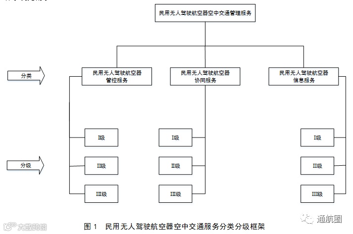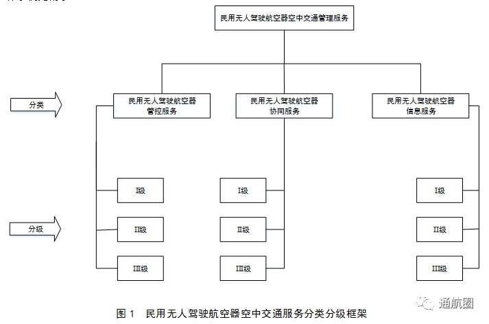 根据《民用无人驾驶航空器空中交通服务要求》征求意见稿,民用无人驾驶航空器空中交通服务应遵守面向运行场景、基于运行风险的分类分级原则,总体分为管控、协同、信息三大类(民用无人驾驶航空器空中交通服务分类分级总体框架见图1,运行分类的具体示例见附录A)。