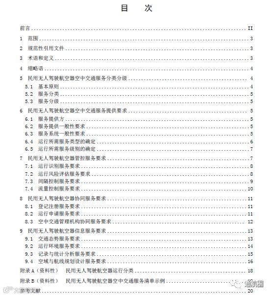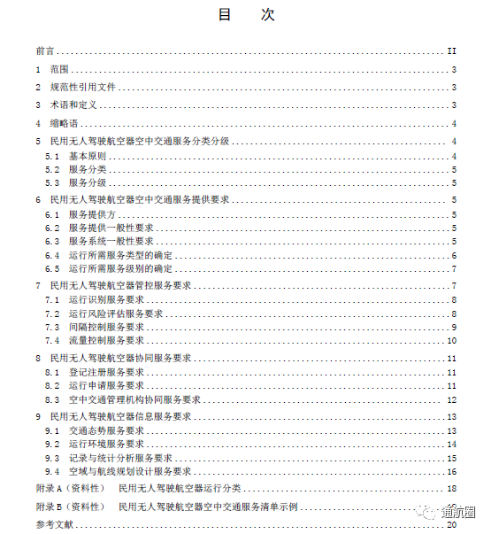 《民用无人驾驶航空器空中交通服务要求》内容主要包括如下:前言、范围、规范性引用文件、术语和定义、缩略语、民用无人驾驶航空器空中交通服务分类分级、民用无人驾驶航空器空中交通服务提供要求、民用无人驾驶航空器管控服务要求、民用无人驾驶航空器协同服务要求、民用无人驾驶航空器信息服务要求、民用无人驾驶航空器运行分类(资料性附录A)、民用无人驾驶航空器空中交通服务清单示例(资料性附录B)等内容。文件的发布,将有效衔接民航局给出的指导意见“应根据民用无人驾驶航空器不同运行类型提供与其运行风险相匹配的空中交通服务,民用无人驾驶航空器空中交通服务应满足相关规范标准的要求。”本文件的实施,将有力推进无人机空管体系的建设和无人机产业发展。