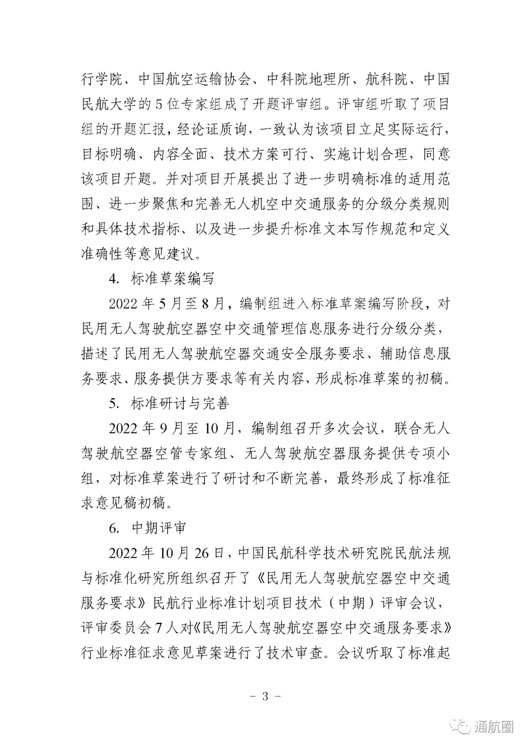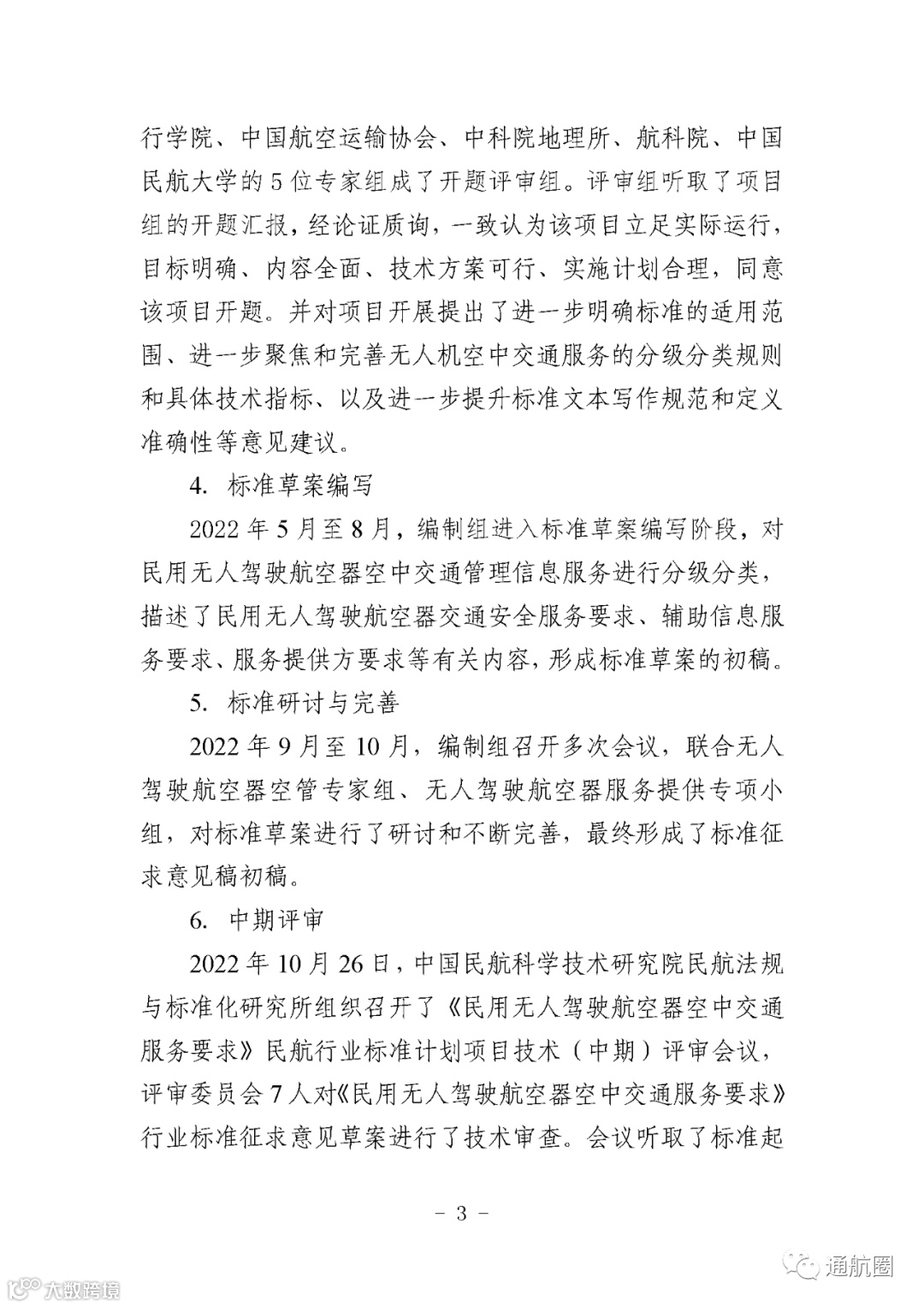 据介绍,《民用无人驾驶航空器空中交通服务要求》为2022年民航安全能力建设资金项目。由中国民用航空局空管行业管理办公室提出,牵头起草单位为民航二所,主要起草单位为中国民用航空总局第二研究所、中国民航科学技术研究院、上海新金山世纪航空发展有限公司、深圳美团低空物流科技有限公司、北京航空航天大学,工作组成员有邹翔、杨非、胡鹏、李宁、张建平、薛彬、柏艺琴、杨俊伟、张霄霄、张伟、闫琰、马林。