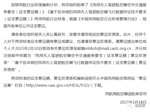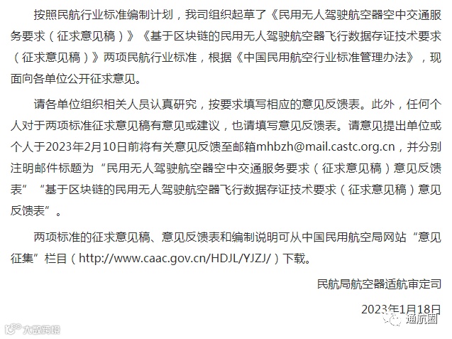 1月19日,中国民航局网站对外发布了《民用无人驾驶航空器空中交通服务要求》、《基于区块链的民用无人驾驶航空器飞行数据存证技术要求》的征求意见稿。根据适航司1月18日的通知,目前正在向各单位公开征求意见,征求意见的截止时间为2月10日。据介绍,《民用无人驾驶航空器空中交通服务要求》旨在明确无人机空中交通服务的类型,提供一个统一的空中交通服务性能标准,确保服务的连续性、完整性、安全性、可获得性,有效解决无人机空中交通服务提供方(USP)与运行人、USP和USP、USP和监管方中空中交通服务不规范、服务质量低、全球互操性弱的问题,满足不同用户的飞行需求,促进无人机产业的快速发展。此外,针对在复杂运行环境下如何保证飞行数据真实性、完整性和不可篡改性以满足监管要求的问题,《基于区块链的民用无人机驾驶航空器飞行数据存证技术要求》通过引入区块链技术,并作为国内无人机运行数据存证的核心技术,提出基于区块链的无人机运行数据存证技术实现方法要求,建立基于区块链技术的无人机运行数据存证符合性指标体系,为运行安全数据监管和运营人飞行数据管理工作的开展提供有效技术支撑和参考标准。