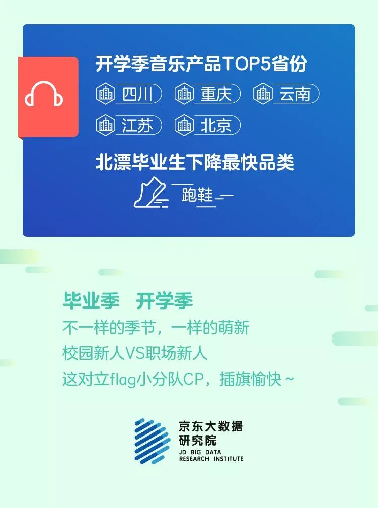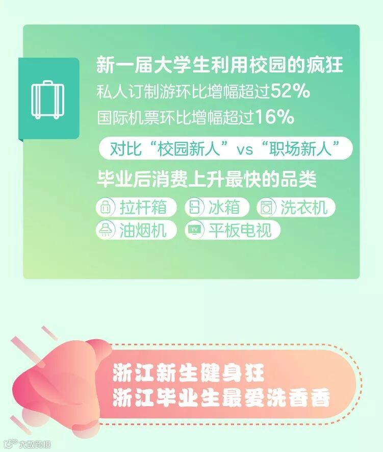 校园新人要环游世界,京东大数据显示私人定制游环比增幅超过52%,国际机票环比增幅超过16%;职场新人想给自己建个小家,数据显示毕业后消费上升最快的品类拉杆箱、冰箱、洗衣机、油烟机、平板电视。