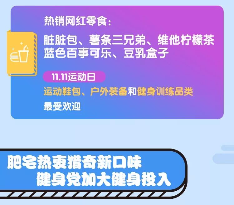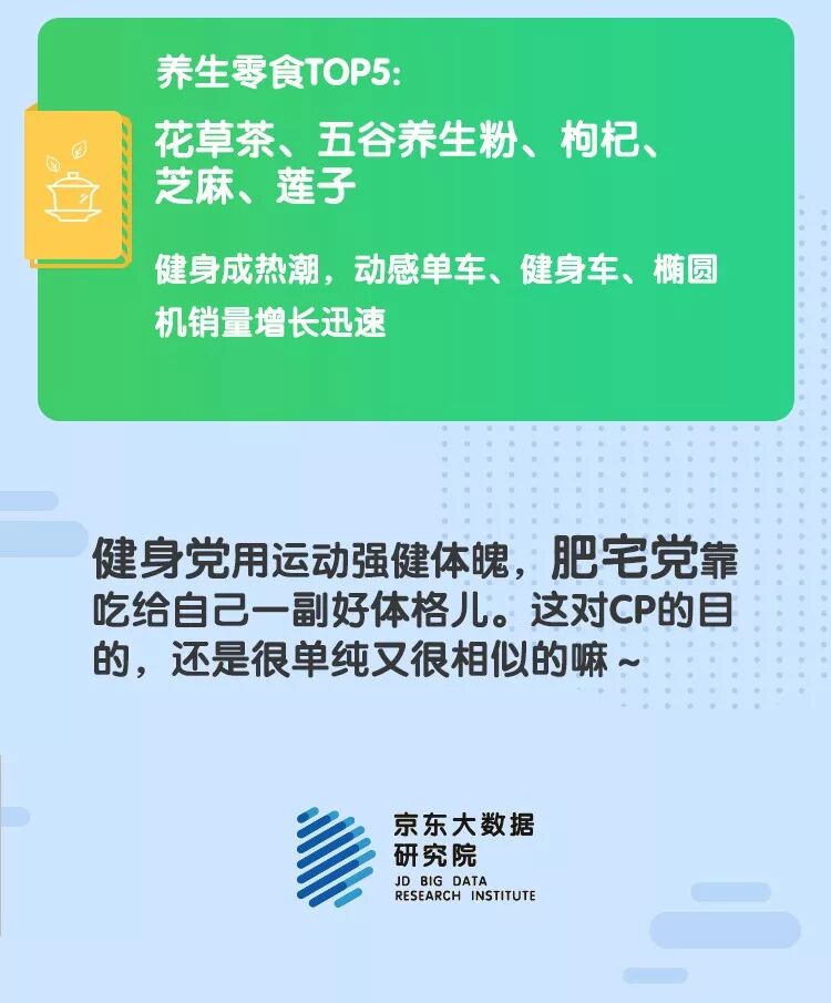 京东研究院同样是吃,肥宅喜欢餐前餐后再吃几口,健身族却能禁欲系进食。京东大数据显示,脏脏包、薯条三兄弟、维他柠檬茶是热销的网红零食;健身党大多喜欢半糖/无糖型食品,比如无糖茶饮料,苏打水,无糖植物饮料热销产品。