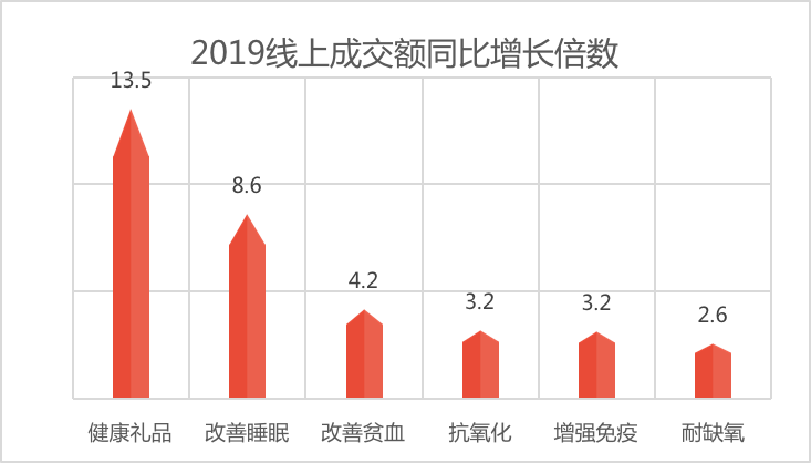 营养健康类商品的市场基数较大,近3年,线上营养保健类消费整体增长了2.2倍,保健品、传统滋补品增长都超过了3倍。2019年,改善睡眠、改善贫血、抗氧化、增加免疫等功能型保健品线上成交额增长最高。