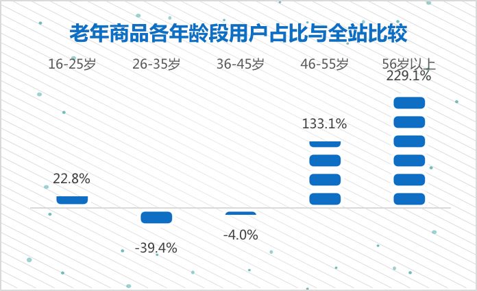 线上消费市场,本身就是一个年轻用户占比较高的市场。如果我们把老年适用商品的用户占比与整体线上市场的用户占比做一个比较,会看到一个不一样的结论。