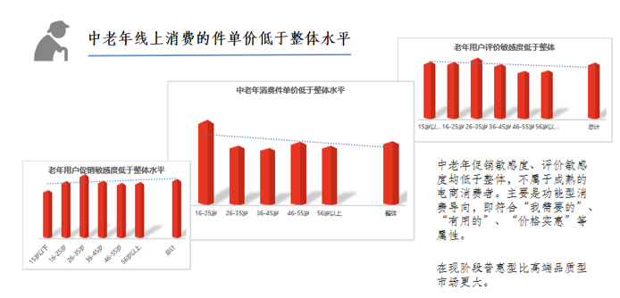 数据显示,中老年线上消费的件单价低于整体水平。消费决策中促销敏感度低于整体,评价敏感度低于整体,尚不属于成熟的电商消费者。消费主要由于功能型消费导向,即符合“我需要的”、“有用的”、“价格实惠”几种属性,在现阶段普惠型比高端品质型市场更大。