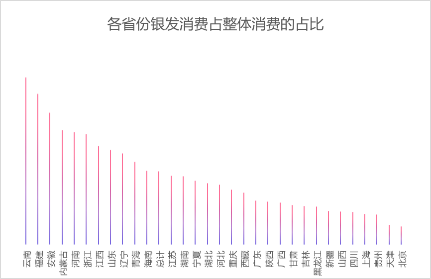 如果将各省份整体消费基数考虑进来,看银发消费成交额占各省份成交额的占比,则呈现出不一样的结论。云南、福建、安徽、内蒙古、河南银发消费成交额占比更高,北京、上海的银发消费占比排名在全国最后5位中。