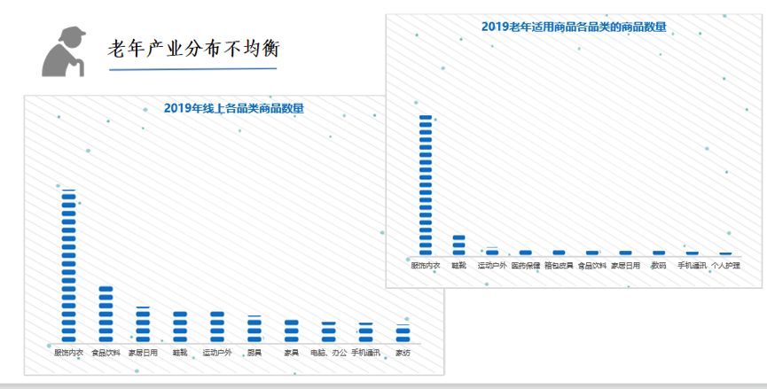 总体来看,近3年老年适用的商品数量,以年均39%的增速增长。2019年市场上的老年适用商品数比2017年增长78%,品牌数的增长近1倍。与线上全部商品的品类分布数量对比,发现老年用品的品类分布呈现的不均衡更为严重。服装鞋帽类商品的丰富度是最高的。其他老年生活需求较高的品类,比如医药保健、家居日用、食品饮料、个人护理等商品还比较少。