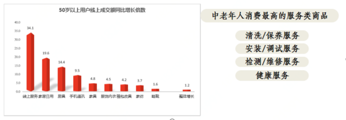 去年开始,线上服务成为消费的一大亮点。中老年人消费最高的服务类商品是清洗/保养服务、安装/调试服务、检测/维修服务以及健康服务。线上服务解决了老年人的生活不便、担心线下服务品质等问题,同时价格透明、线上提问、评价等信息给了消费者保障,同时也有助于服务人员保障服务品质,以获得更多用户的好评。