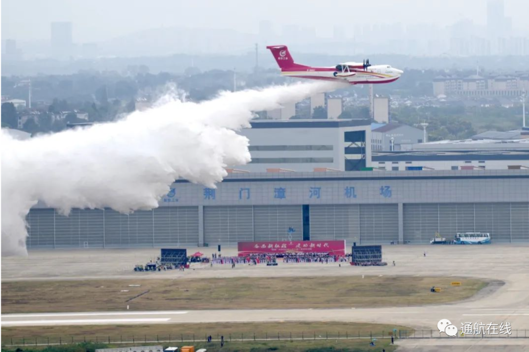 9月27日上午由我国自主研制的“鲲龙”AG600M灭火机以全新消防涂装在湖北荆门漳河机场成功完成12吨投汲水试验并签署首批6架机购机协议,标志着该型飞机迈出了市场化开拓和实战化应用的关键一步