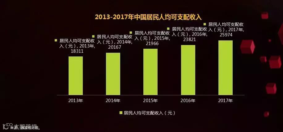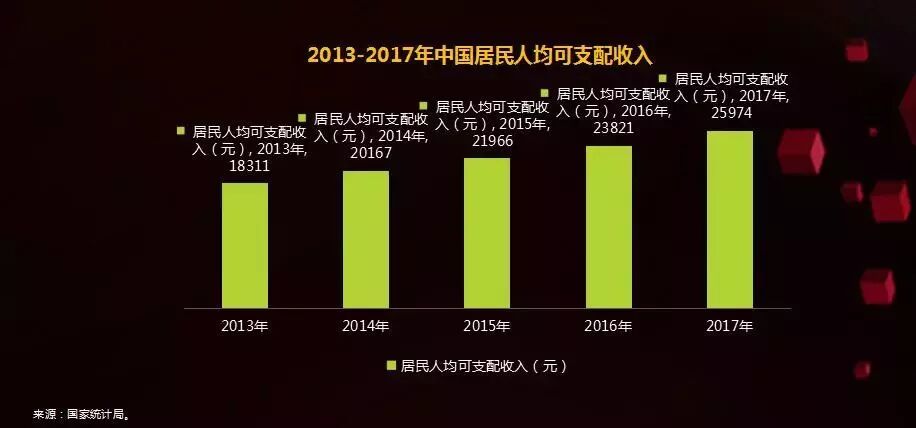 二是消费实力增强。随着我国经济发展,我国人均可支配收入持续增长,已从2013年的8896元增长至2017年的25974元。据国家统计局数据,目前我国中等收入群体已超过3亿人,大致占全球中等收入群体的30%以上。中等收入群体具备较高的收入和消费活力。