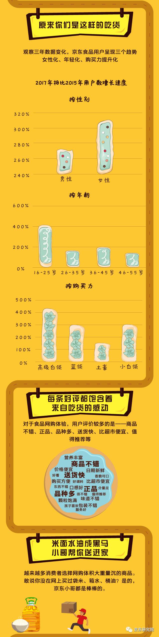 根据京东对于食品网购消费数据研究,可以看到,近年来选择在网上购买食品、酒类的用户越来越多,其中女性和年轻人是购买主力。