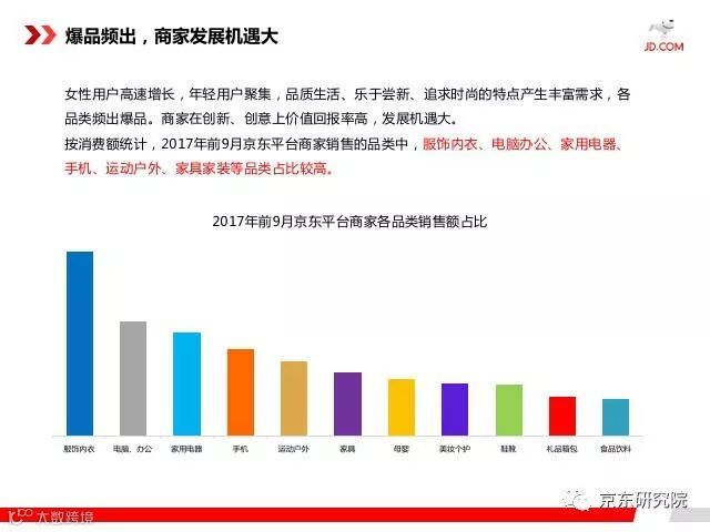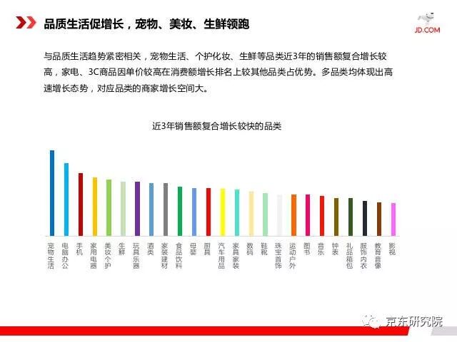 品质生活促增长,宠物、美妆、生鲜领跑。2017年前9月京东平台商家销售的品类中,服饰内衣、电脑办公、家用电器、手机、运动户外、家具家装等品类占比较高。与品质生活趋势紧密相关,宠物生活、个护化妆、生鲜等品类近3年的销售额复合增长较高,家电、3C商品因单价较高在消费额增长排名上较其他品类占优势,多品类均体现出高速增长态势,对应品类的商家成长空间大。