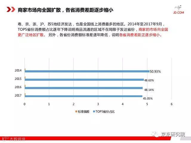 各省消费差距逐步缩小,三至六线地区购买力释放。从各地消费水平来看,粤、京、浙、沪、苏5地经济发达,也是全国线上消费最多的地区。2014年至2017年9月,TOP5省份消费额占比逐年下降,说明商品流通的区域不在局限于发达省份,商家的市场和影响力向全国更广泛地区扩散。另外,各省份消费额标准差逐年降低,说明各省消费差距正逐步缩小。