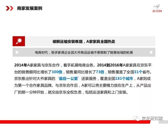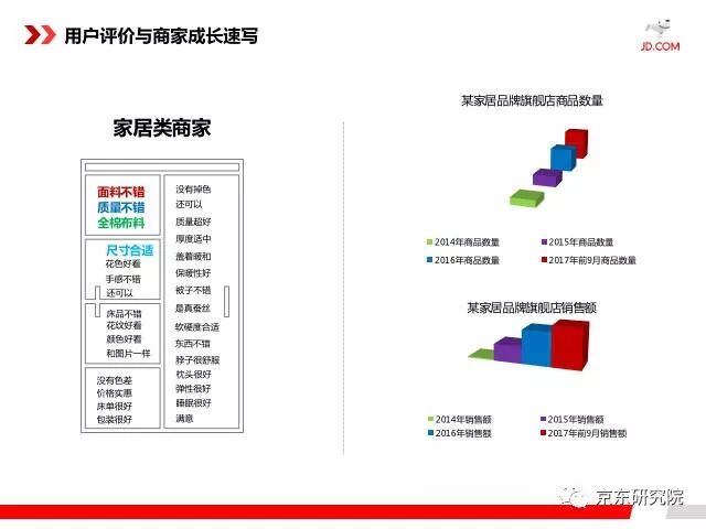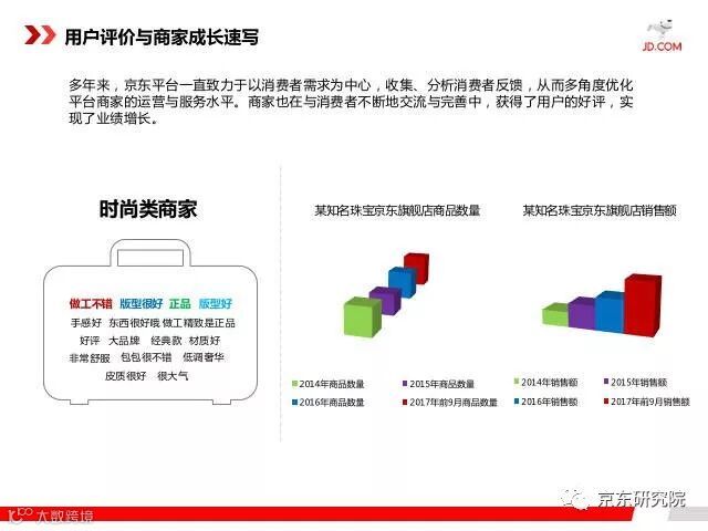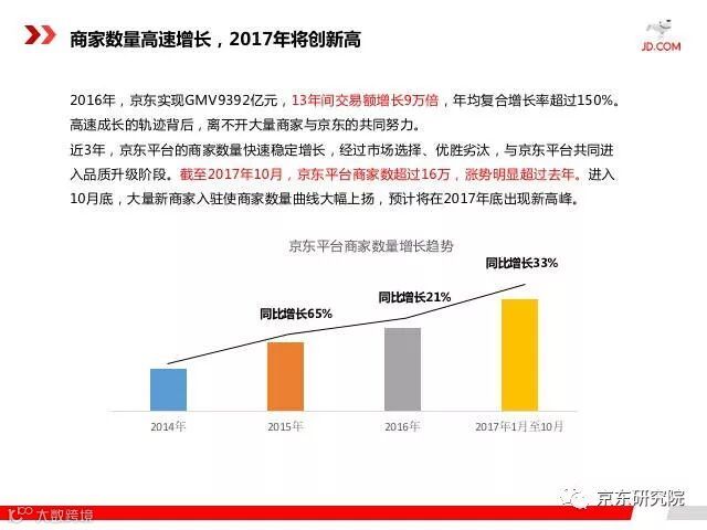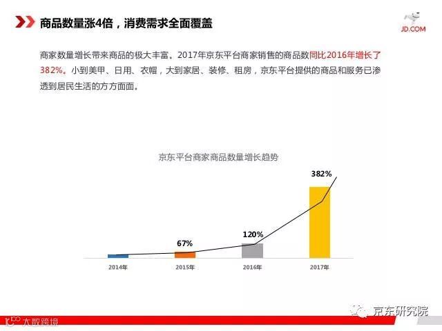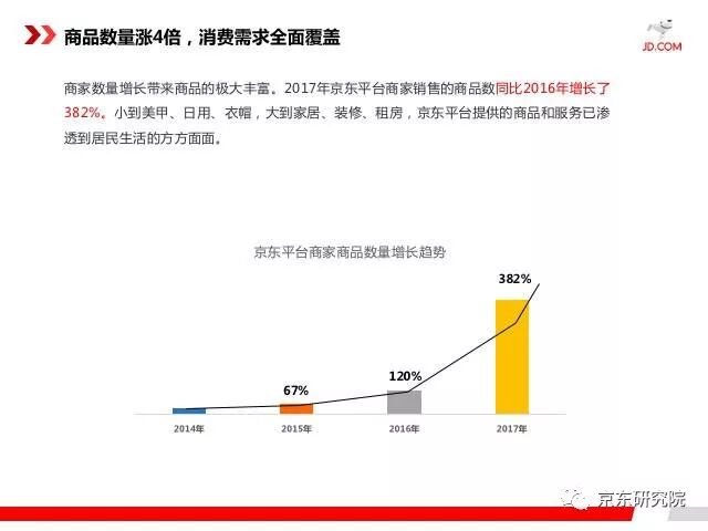 商家与平台共成长、用户好评与信任度是可持续增长沃土。截至2017年10月,京东平台商家数超过16万,涨势明显超过去年。2017年前9个月,京东平台商家销售的商品数是2016年的近5倍。小到美甲、日用、衣帽,大到家居、装修、租房,京东平台提供的商品和服务已渗透到居民生活的方方面面。