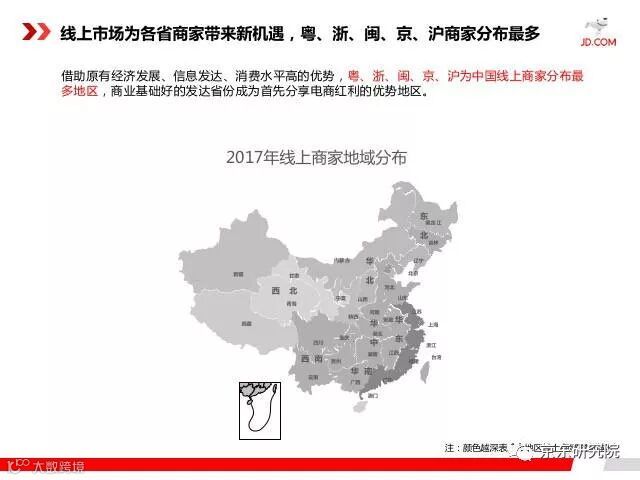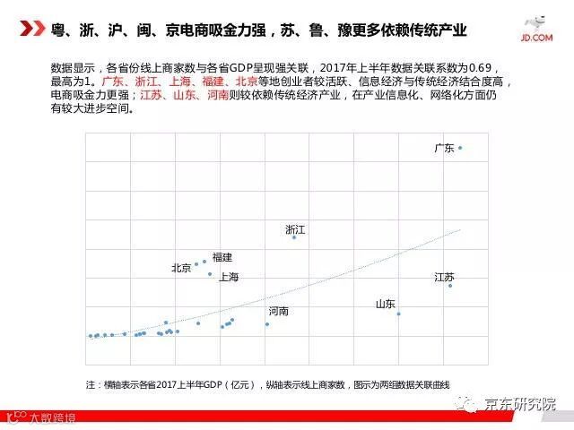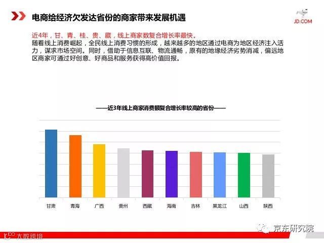 粤、浙、沪、闽、京电商吸金力强,苏、鲁、豫更多依赖传统产业。粤、浙、闽、京、沪为中国线上商家分布最多地区,商业基础好的发达省份首先分享了电商红利。同时,电商也给经济欠发达省份的商家带来发展的新机遇。甘、青、桂、贵、藏,线上商家数复合增长率最快。原有的地缘经济劣势消减,偏远地区商家可通过好创意、好商品和服务获得高价值回报。
