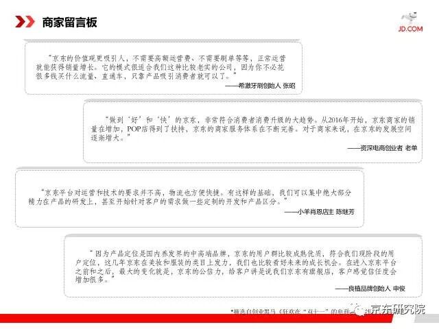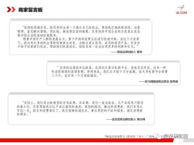 “我特别感谢京东,给所有创业者一个健康成长的机会,帮助我们做战略指导、运营管理,解决营销、供应链、物流等层面的难题。京东扶持商家的力度真正是在做中国企业的基础设施服务。”
