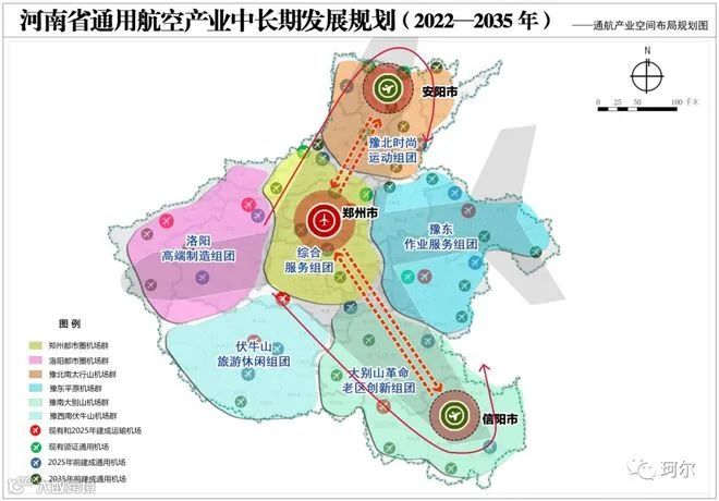 六组团:建成六个独具特色的通用航空产业组团。依托郑州、开封、许昌豫中通用机场群,建设辐射全省、功能齐全的中部综合服务组团;依托安阳、濮阳、鹤壁、焦作、新乡豫北通用机场群,建设时尚运动组团;依托信阳、驻马店豫南通用机场群,打造大别山革命老区创新组团;依托洛阳、三门峡、济源豫西通用机场群,打造高端制造组团;依托南阳、平顶山豫西南通用机场群,打造伏牛山旅游休闲组团;依托商丘、周口、漯河豫东通用机场群,打造豫东作业服务组团。