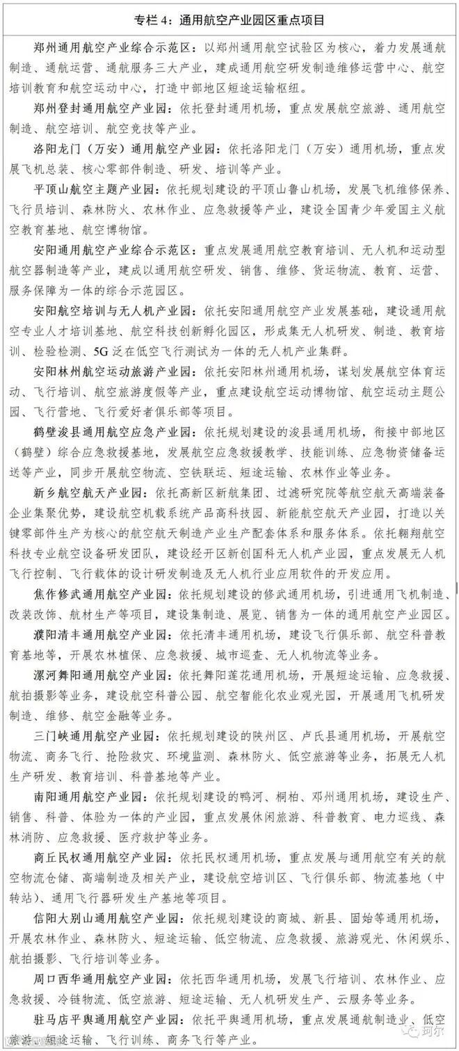 多园区:谋划布局多个通用航空产业园区。以郑州和安阳国家通用航空产业综合示范区为引领,加快安阳、洛阳、周口、商丘、南阳、信阳等空港经济区发展,建成一批通用航空产业园、无人机产业园,构建全省通用航空产业发展的多层次支撑平台。