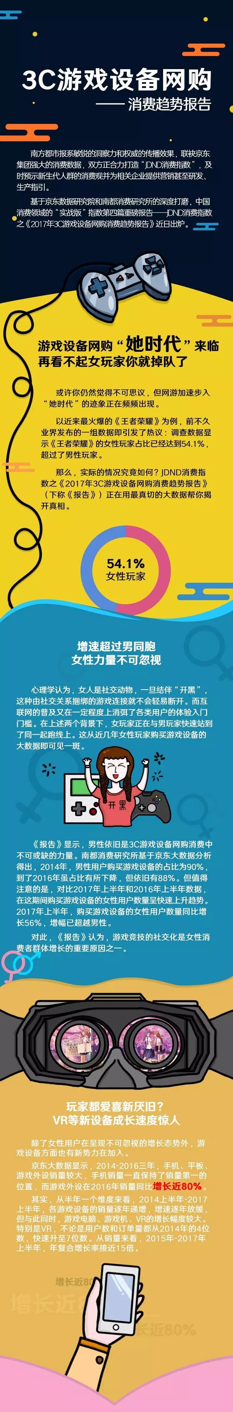 由京东数据研究院与南都消费研究所发布的《2017年3C游戏设备网购消费趋势报告》出炉,报告指出,当前游戏设备网购正在迎来“她时代”,女性玩家增速首次超越男性。