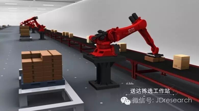 京东的无人仓中也有我们比较熟悉的机器人——六轴机器人可实现拆码垛,就是堆放和移动商品。码垛算法的指导下,每种商品都可以自动生成个性化的垛型,由机器人自动适配对每种商品自动码垛。