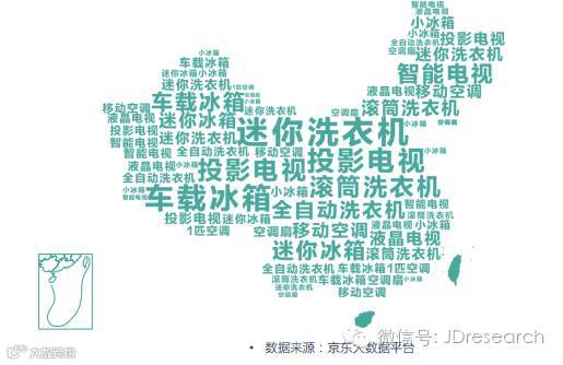 京东大数据显示,山东、辽宁、河北、四川、湖北、陕西、天津等地用户购买家电的目标比较明确。通过用户搜索关注点可以看出,迷你冰箱、车载冰箱、迷你洗衣机、移动空调、投影电视等都是搜索热词,可见在洗衣机、冰箱、空调、电视等大家电品类,用户已经进入重复性、补充型消费。