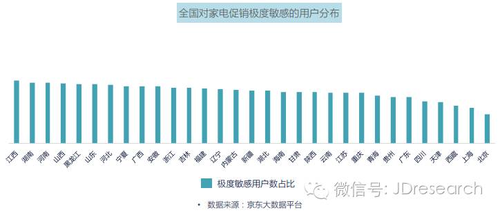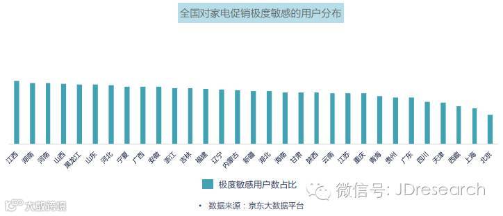 京东大数据显示,家电网购消费者并不十分热衷于促销,对家电商品促销非常敏感的消费者仅占51.91%。全国各省中,江西、湖南、河南的用户最关注家电的促销活动,以甘肃、青海为代表的西北人民对家电的促销最不感冒。