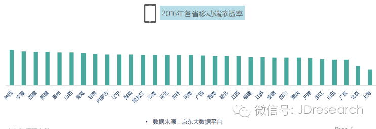 2016年上半年,全国家电购物移动端渗透率近八成。其中西部渗透效果最明显,陕西、宁夏、西藏、新疆、贵州、山西以超过83%的移动端渗透率,成为全国移动端使用率最高的地区。而北京、上海等成熟市场的移动端渗透率反而不及前者。
