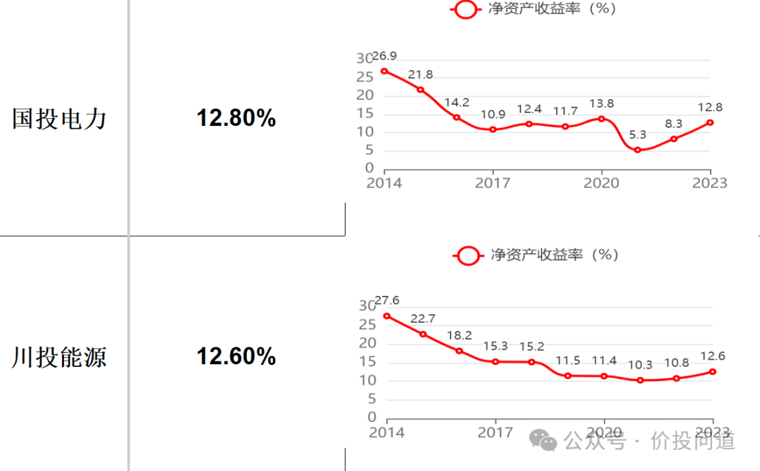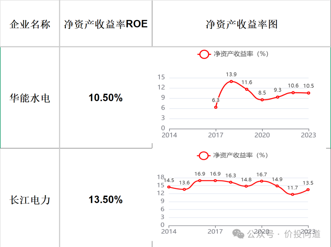 水电行业有重资产属性,净资产收益率都不是太高。华能水电在10%左右,长江电力在15%左右,近两年略微下来一点,还是比华能水电高。国投电力也是10%左右,不过起伏比较大。川投能源也是10%左右。