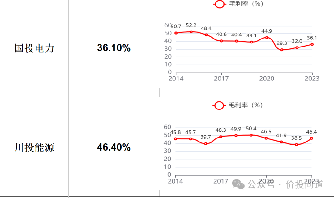 华能水电的毛利率基本上常年稳定在55%左右,长江电力稳定在60%左右。国投电力的毛利率起伏就比较大一些,并且数值也低一些,大概在40%左右。这主要是由于国投电力还有占比三分之一的火电业务,火电的毛利率比水电要低。