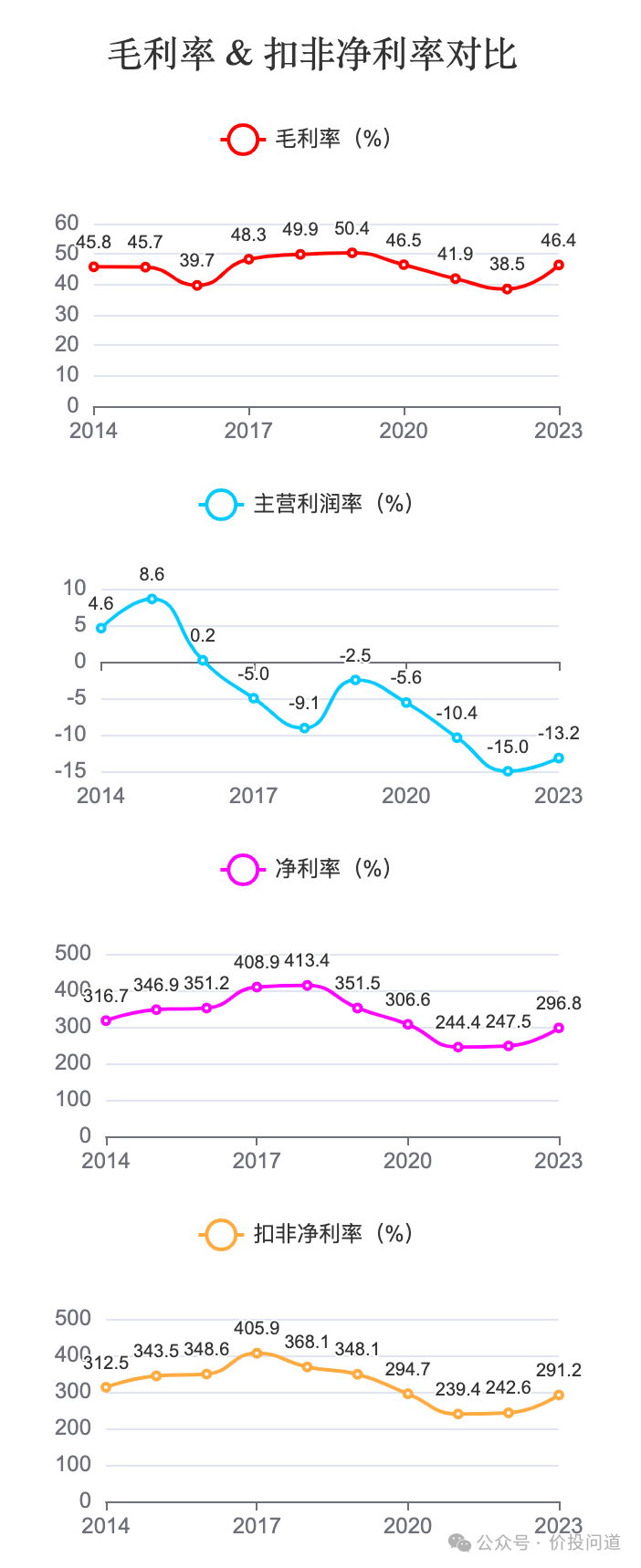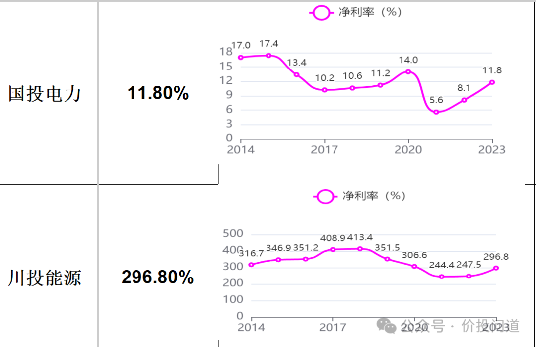 川投能源的毛利率在40%左右,主营利润率多年为负数,而净利率却接近300%。