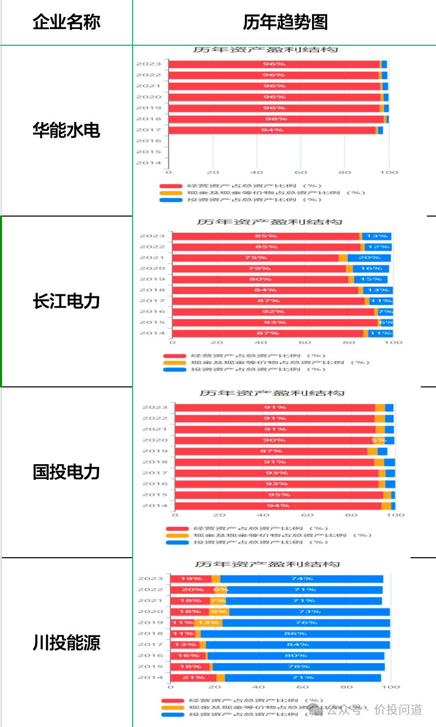 对比四家企业的历年资产盈利结构,其他三家都是经营资产占大头,唯有川投能源是投资资产占了70%以上。这就是其特殊的商业模式导致的。