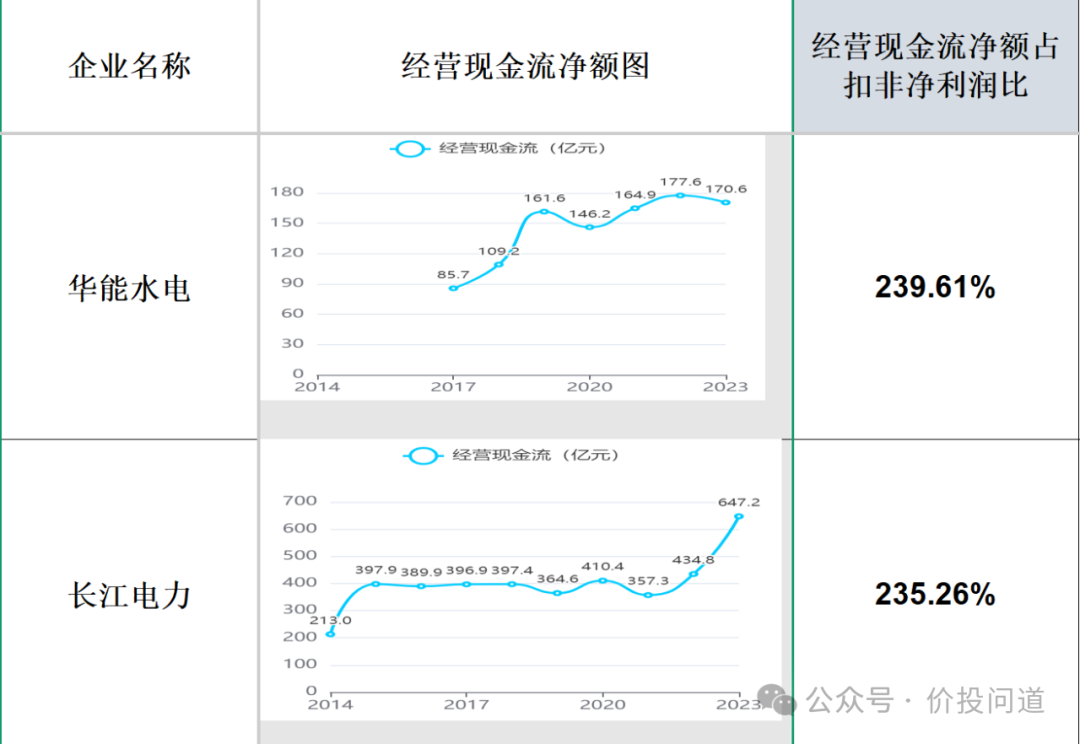 第二个,经营活动产生的现金流量净额。可以看到华能水电、长江电力、国投电力历年来经营现金流净额都非常稳定,而且是扣非净利润的2到3倍。
