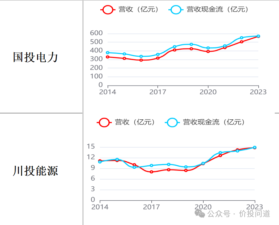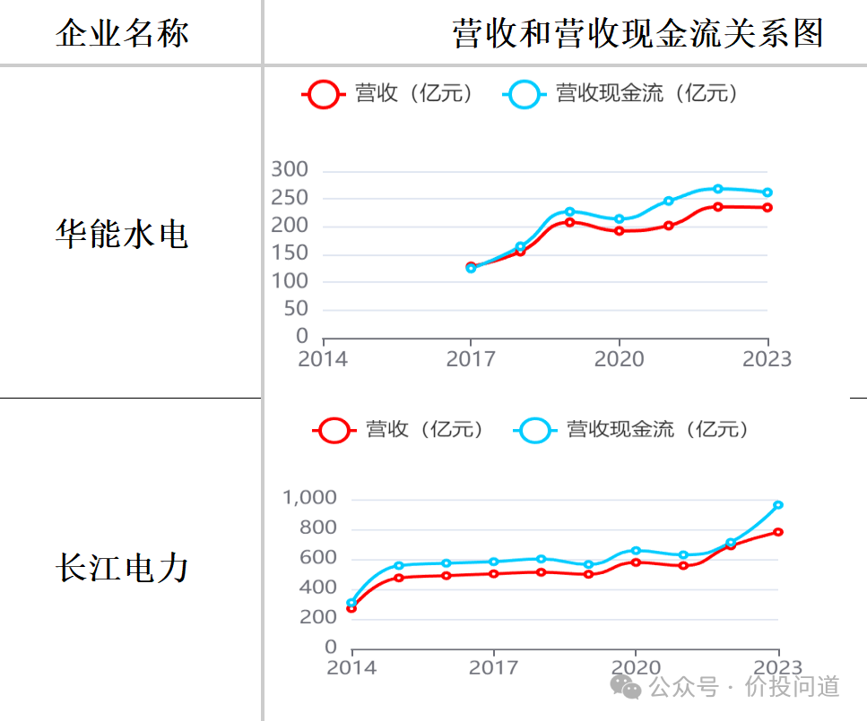 第一个,营收现金流。可以看到华能水电、长江电力、国投电力历年来应收现金流都是高于营收的。