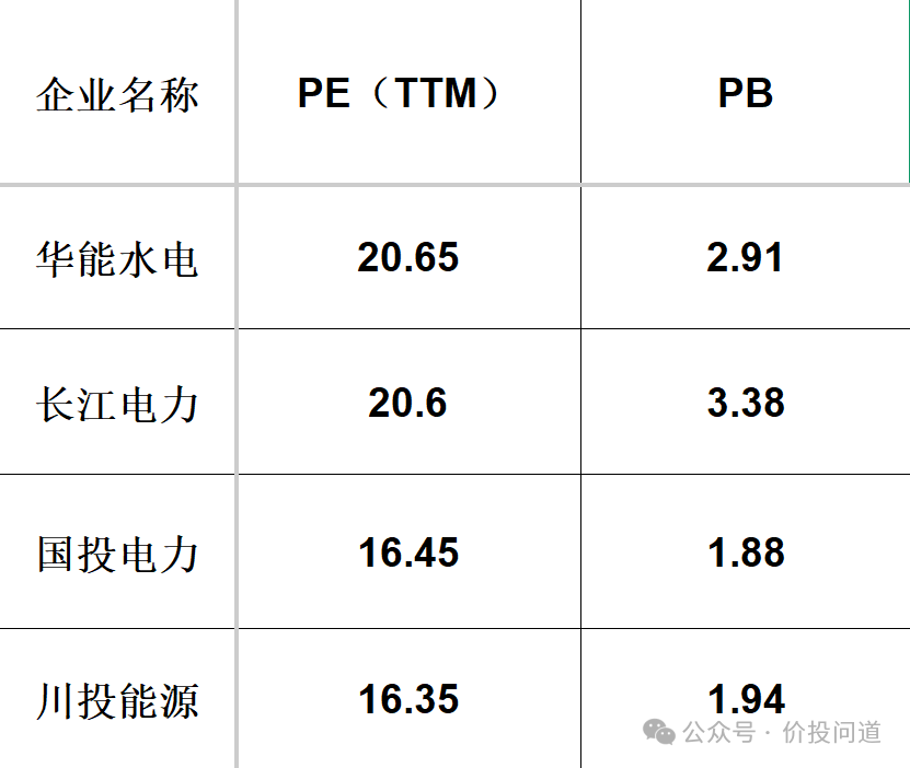 截止本文写作时间,华能水电和长江电力的PE都是20,PB都在3左右;国投电力和川投能源的PE都是16,PB都在2左右。国投电力和川投能源相对来说估值要低一些。