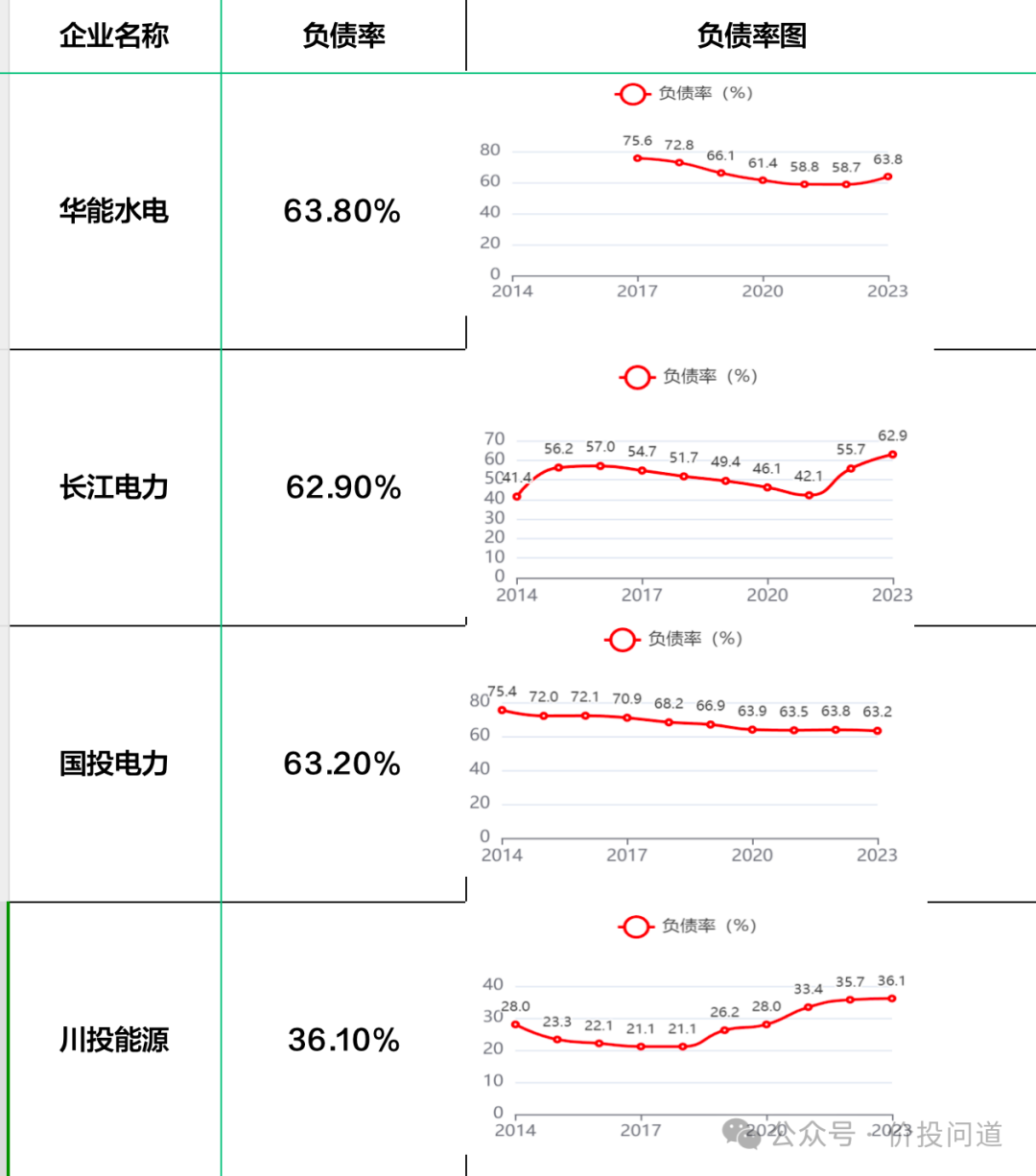 往年的负债,也就是长江电力控制的最好,在50%左右,这两年新并了两个电站,负债率也上来了。华能水电和国投电力的负债率一度都是去到了70%以上,慢慢降到了60%左右。