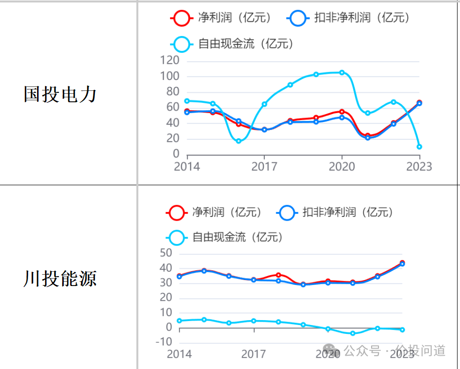第三个,自由现金流。华能水电和国投电力的自由现金流,围绕扣非净利润上下波动,多数年份都是高于或者和扣非净利润基本相等。长江电力的自由现金流表现更好,长年稳定高于扣非净利润。