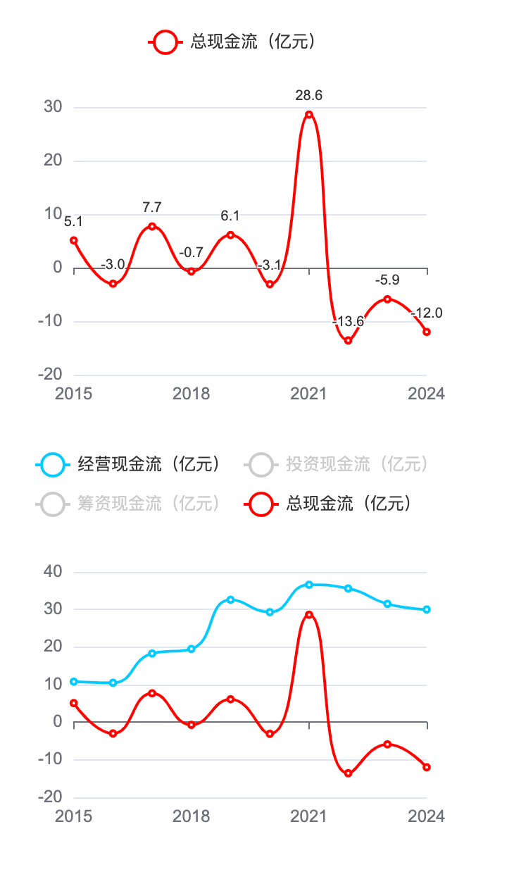 总现金流有正有负,经营现金流始终高于总现金流,现金流情况还是很健康的。