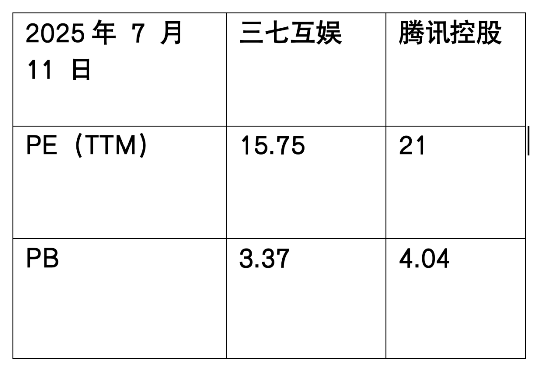 截止本文写作时间,三七互娱PE是15.75,PB是3.37。算是比较合理的估值了。不过,一方面2025年业绩的下滑不知道是否还会持续;另一方面,游戏第一股腾讯的PB是4.04,PE是21,腾讯的确定性要高多了,但是估值并没高太多,对比之下,三七互娱这个估值的吸引力就下降了。