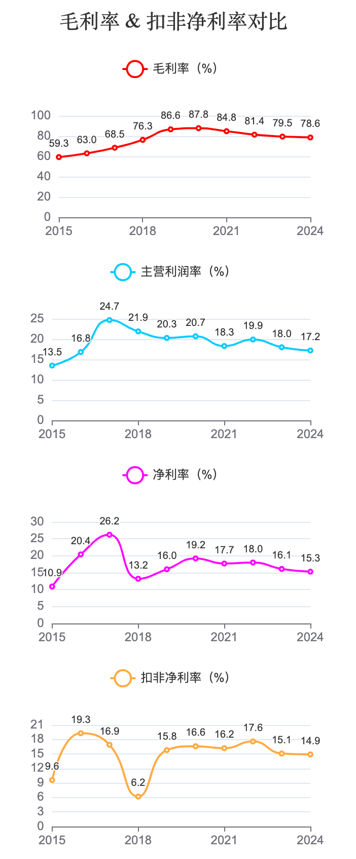 我们看利润率。毛利率基本持平,略微降低,成本还是有略微升高。2024年毛利率是78.6 %。这是非常高的毛利率表现。