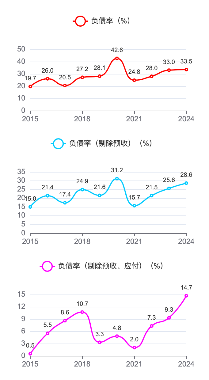 负债率比较低,2024年33.5 %,扣除预收、应付之后,降到了14.7 %,负债风险不高。