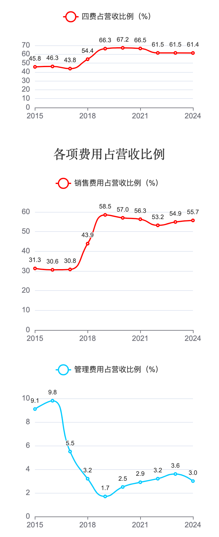 再看下费用。四费占了营收的61.4 %,侵蚀了很多毛利润。这里面最主要的就是销售费用,占了营收的55.7 %。