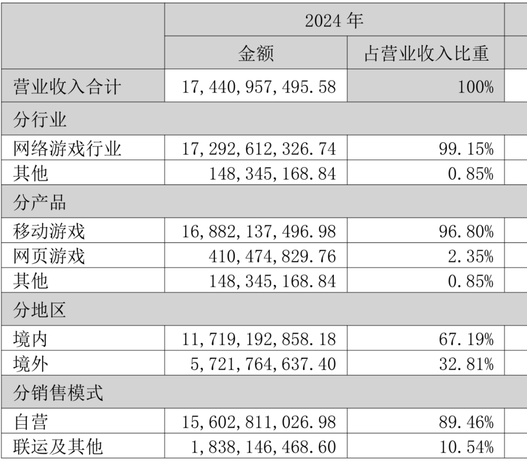 到了2024年,移动游戏占比97%,海外市场和国内市场的比例大约是1:2。自营渠道占了89%。成功从40%左右低毛利的网页游戏,转型成了接近80%高毛利的移动游戏。