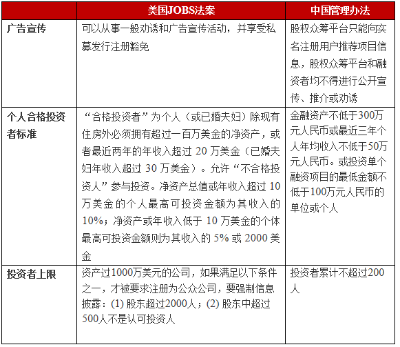 从以上中美政策对比来说,中国的政策尚不健全且偏保守。此外,美国JOBS法案已生效,中国《管理办法》还在修改中。中国《管理办法》中投资者门槛较高,在该方面市场议论较大。但是有消息称,中国证券业协会对《管理办法》进行了修改,主要集中在降低投资者门槛上:投资者投资单个融资项目的最低金额要求,从不低于100万元降至不低于10万元;金融资产方面,从不低于300万元降至不低于100万元,或最近3年个人年均收入不低于30万元(个人)。以上消息尚需进一步确认。